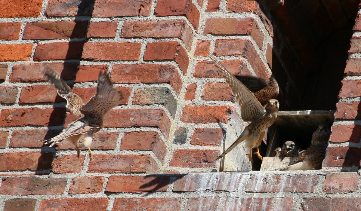 How's this? A little falcon family celebrates a parent returning with lunch.